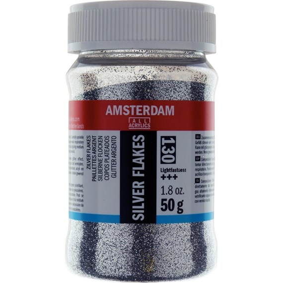 Create a silver glitter effect by adding these flakes to various gloss mediums, mix them with transparent paints, or sprinkle them over your wet paint. Fixate them with a gloss varnish to preserve the effect.