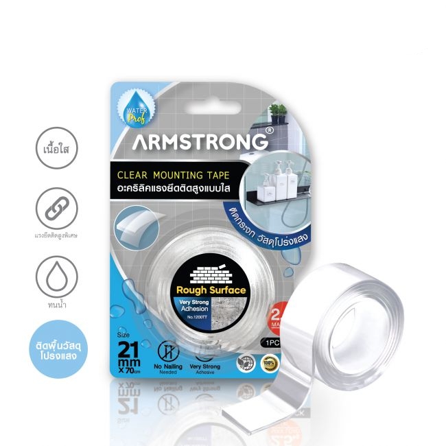 ARMSTRONG Clear Mounting Tape is very high bond adhesive tape suitable for various surfaces such as glass, plastic, marble, ceramic etc..