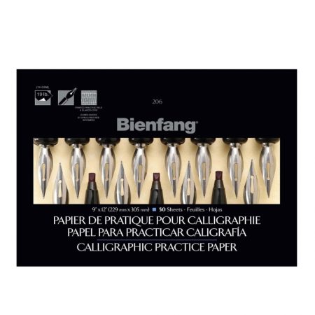 Bienfang Calligraphic Practise Paper Pad. This package contains fifty 23cm x 30cm sheets of 8.6kg weight calligraphy practise paper. Each sheet features a printed practise rule and slanted grid to make practising simple and easy.