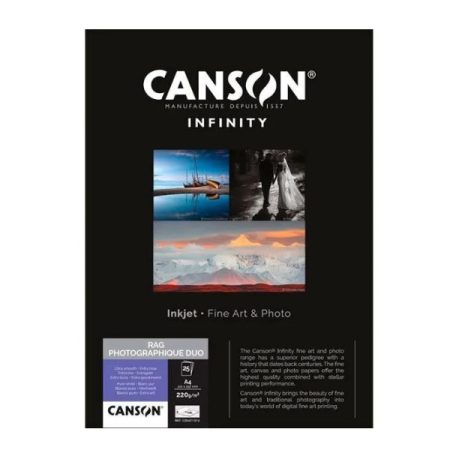 This 100% rag double-side coated paper offers an exceptional pure white tone using natural minerals and an extra smooth, sensual surface. Canson® Infinity Rag Photographique Duo provides one of the highest achievable Dmax currently available on the market.