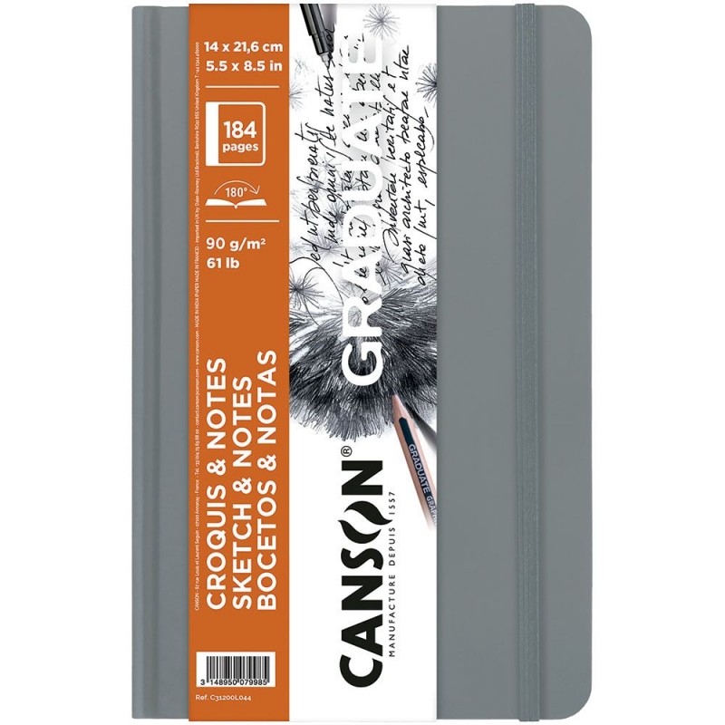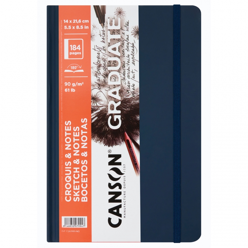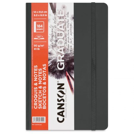 Sketch quick concepts and jot down notes all in one place with these conveniently sized Canson Graduate Sketch & Note Hardcover Books. Featuring a soft, flexible spine, each 5-1/2″ x 8-1/2″ (14 cm x 21.6 cm) hardbound book contains 92 sheets (184 pages) of light-grain, acid-free 61 lb (90 gsm) paper. Includes an attached elastic band closure and convenient bookmark.