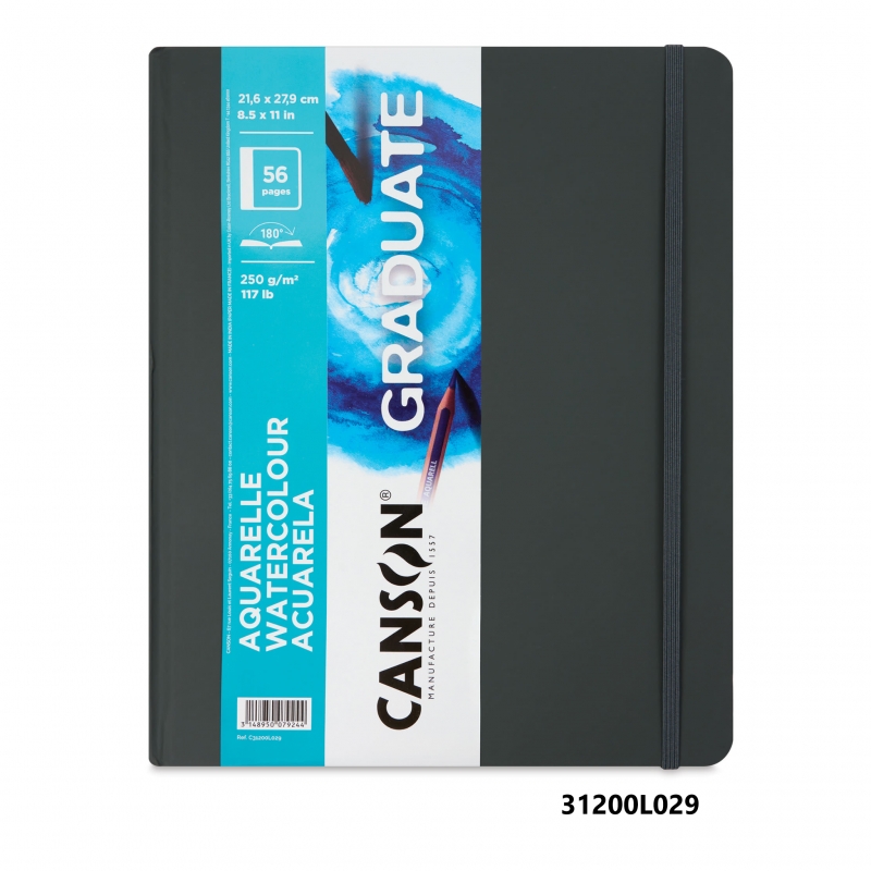 The Canson® Graduate Watercolour notebook has an attractive recycled fibre cover with rounded edges and an elastic fastening. Its 56 pages of heavyweight double-sided white paper (250 g/m²), with a fine, light grain, will give you optimum results.