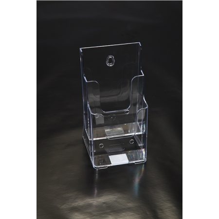 Clear two compartment tier brochure holder, 4 3/8″ x 8″ x 4″. For material up to 4″ wide with 1 15/16″ capacity. Features holes for mounting.