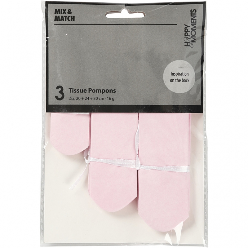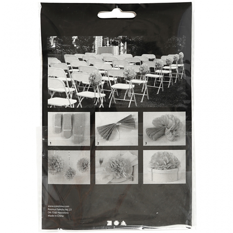 Airy pompoms made of silk paper. They fold out into round balls and are tied with string. Pack includes 3 different sizes. Supplied unassembled.
