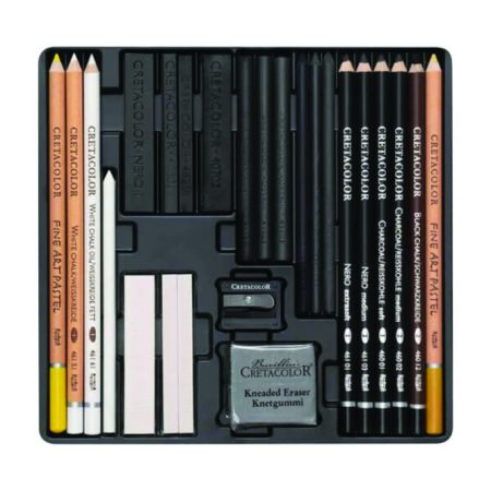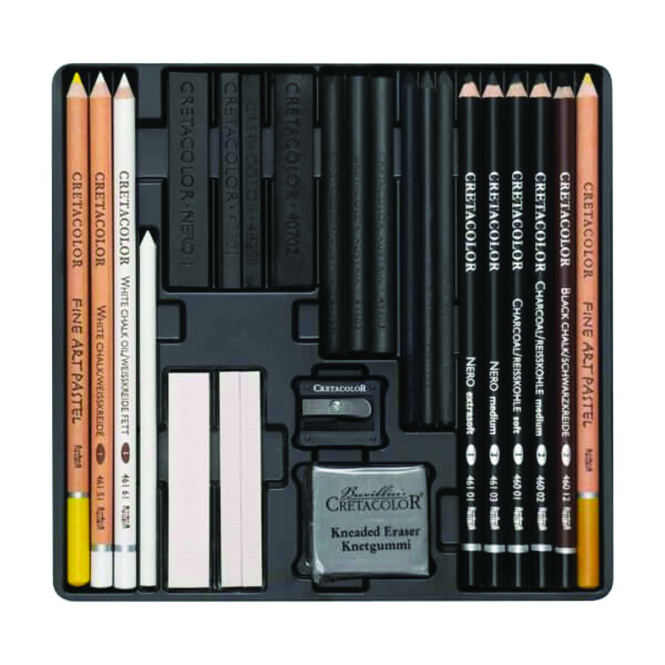 Contents: White Pastels, Artist Sticks, Hard Pastels, Nero Sticks, Sketching Charcoal, Compressed Charcoal, Fine Art Pastel Pencils (chromium yellow, ochre light), sharpener, kneaded eraser and polishing leather.