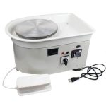 Sit-down potter’s wheel with foot pedal speed control for table top operation from 0-300 rpm in either direction via 350 watt motor.