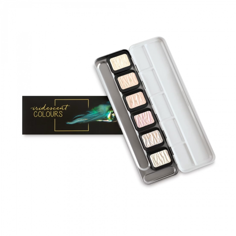 The FINETEC watercolour collection consists of a variety of pearlescent, iridescent and Flip-Flop colours, all made with ethically sourced natural mica or synthetic substrates that provide a beautiful sheen. These 6 iridescent colours are beautifully transparent and shimmer in the light almost magically on a lighter background, but on a dark surface, they show their eye-catching true colours and extraordinary sparkle.