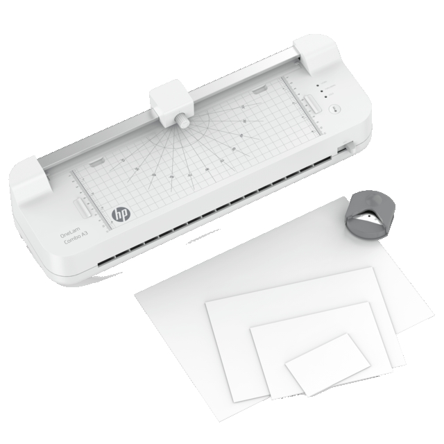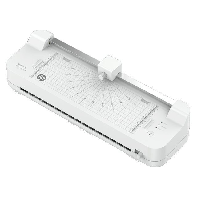 Compared to the HP OneLam 400 A3, the HP OneLam Combo A3 scores with an integrated cutter, which makes it even easier to cut your documents in straight, curled or perforated format. Through use of the angle presets and centimetre grid, your laminated documents can easily be cut to the desired size. Like the other laminators in the HP OneLam range, this handy backloader is suitable for both hot and cold lamination. With a film thickness of 75/80 to 125 microns, you can protect your pictures, timetables or important documents from business cards up to A3 format from dirt and moisture.