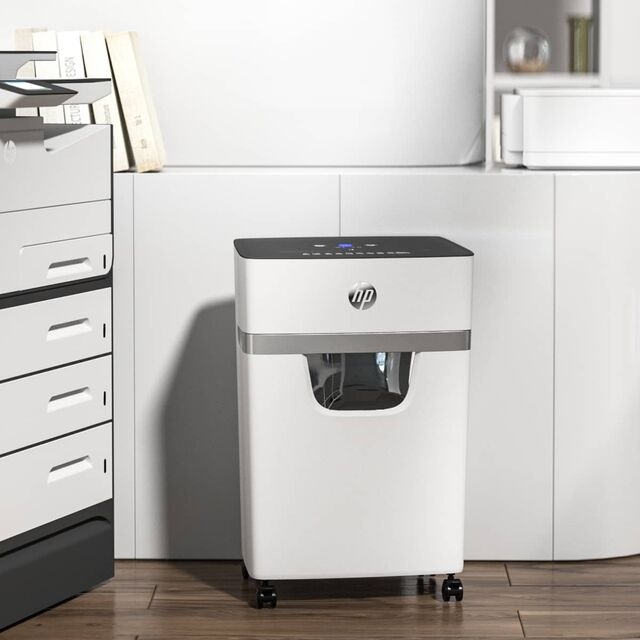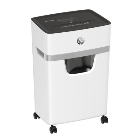 The reliable HP OneShred 10MC shreds up to 10 A4 sheets at a time to 2 mm x 15 mm clippings in micro-cut mode and has the high security level P-5. This modern document shredder thus fulfils all requirements for the data protection-compliant destruction of personal data, such as patient files and process documents, and is therefore also suitable for use in doctors’ surgeries or law firms. With an operating noise level of 65 decibels, the white paper shredder operates relatively quietly and, in addition to your documents and credit cards, also destroys paper clips and staples to dispense with their tedious removal before shredding.