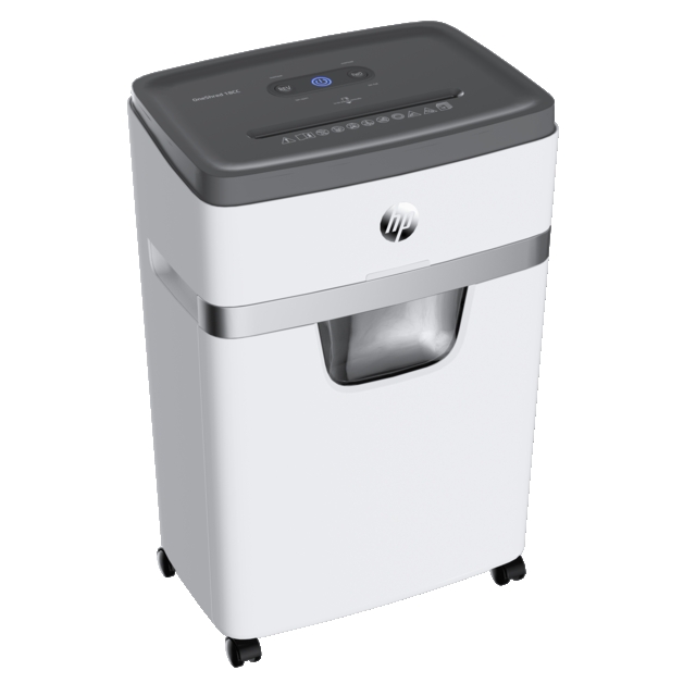 The HP OneShred 18CC is a reliable paper shredder with a cutting capacity of 18 A4 sheets at a time and is a quintessential feature of any open-plan office. This modern document shredder on castors features the high security level P-4 and shreds your sensitive data in particle cut into 4 mm x 35 mm clippings. Proper shredding of payroll or tax documents, which are considered personal documents, is thus guaranteed in accordance with data protection regulations. If the HP OneShred 18CC is not used for more than 30 minutes, it automatically switches to sleep mode and power consumption is reduced to less than 0.5 watts. The powerful office shredder requires a comparatively short cooling time of 20 minutes after continuous use.