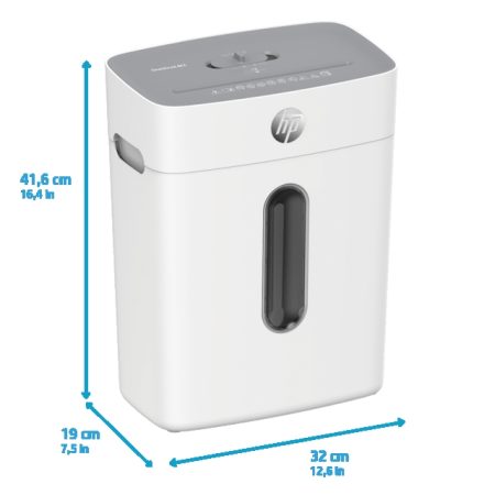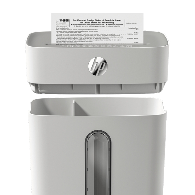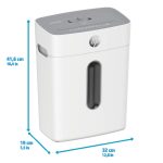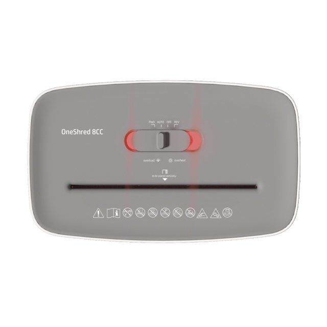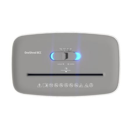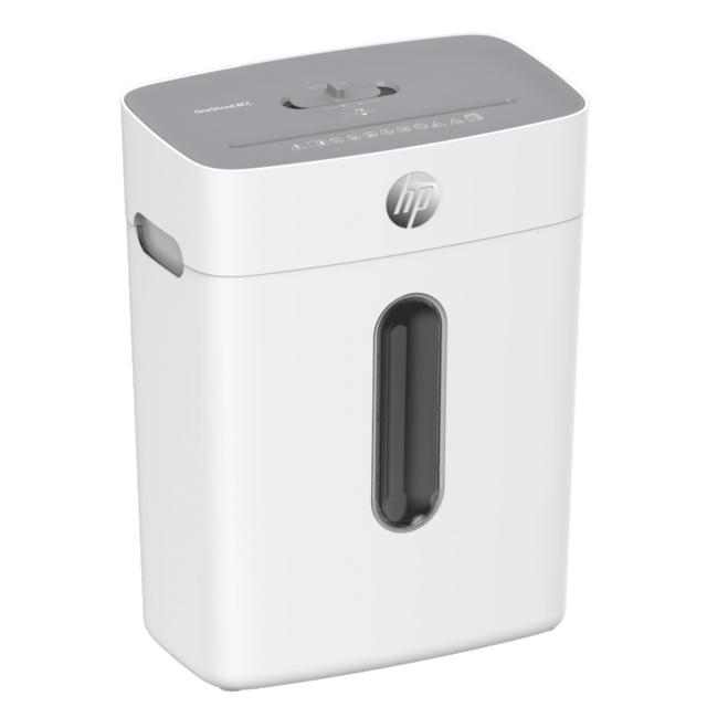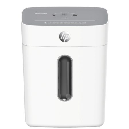 The handy document shredder HP OneShred 8CC in modern design is a quintessential feature of any household and fits next to every desk. Thanks to the high security level P-4, the DSGVO-compliant shredding of sensitive data such as salary slips and tax returns is guaranteed. Up to eight DIN A4 sheets can be shredded at the same time in particle cut via the intuitive operation. Even paper clips, staples and credit cards are no problem for this reliable shredder. The shredder has an automatic reverse function in the event of a paper jam, as well as an overheating and overload indicator. Thanks to the viewing window, you are always alerted when the box needs to be emptied, even without a technical fill level indicator for the waste bin.