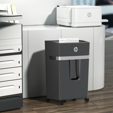With a cutting capacity of 10 sheets, the compact HP Pro Shredder 10MC comes rolling in as the smallest document shredder from the HP Pro Shredder series. Nevertheless, this mobile helper holds its own in the micro cut and is therefore not only suitable for small office environments, but also for medical practices and law firms. The elegantly designed document shredder shreds your personal company data, patient files or process documents in micro cut into 2 mm x 15 mm clippings. This meets the requirements for the high security level P-5 and ensures destruction in accordance with the General Data Protection Regulation. Like the other HP Pro Shredders, the 10MC is pleasantly quiet and produces an operating noise of only 55 decibels.