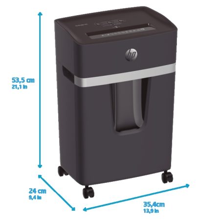 The elegant HP Pro Shredder 15CC in black design fits next to any desk and should not be missing in any office. With a shredding capacity of 15 A4 sheets, the document shredder shreds your sensitive company data in cross cut into 4 mm x 35 mm clippings and thus meets the high requirements of security level P-4. This ensures the destruction of personal documents such as employment contracts or payrolls in accordance with the data protection directive. The convenient shredder with lockable rollers scores points compared to the similar device from the oneshred series with a particularly quiet operating noise of only 55 decibels and a longer operating time of 20 minutes.