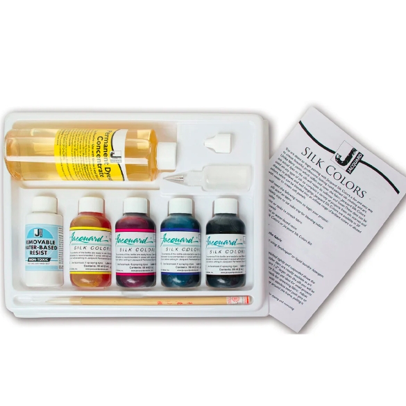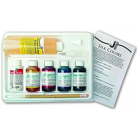 Get started silk painting today! Jacquard’s Green label silk colors dyes make it easy, and these kits have everything you need in one neat package. Watch how the dye flows as you touch the brush to the fabric. These rich, transparent colors let the luster of silk shine through. And with the four included colors you can mix any color imaginable. Use our Silk Colors mixing chart merely as a jumping off point.