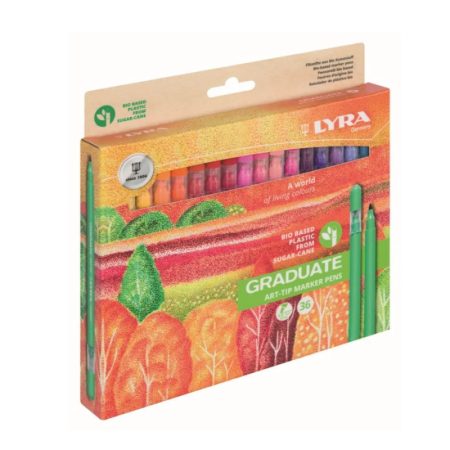 The new ART-TIP markers are made for more than 64% (body, cap and colored part of the cap) in bio-based material, i.e. with plastic generated from sugar cane. An important step for an increasingly sustainable future: bio-based plastic made from sugar cane (or green polyethylene) is in fact a renewable resource that contributes to the reduction of greenhouse gas emissions (CO2)