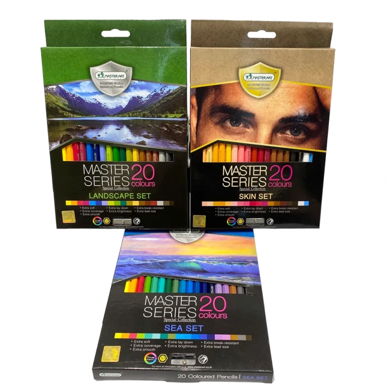 Master Series 20-color colored pencils, Lanscape Special Collection, a special set for those who want to create landscape paintings. Allows you to imagine unlimited art. Suitable for those who love to draw landscapes. Extra large lead size 3.3 mm. Larger than standard size, with a new lead formula, excellent quality, a special formula from Master Art. With a lead size of up to 3.3 mm, it makes coloring fast and full area. Master Art Master Series colored pencils provide natural shades, beautiful and realistic, in accordance with international standards. The color shade will be specified on every pencil. Every Master Art Master Series colored pencil has passed quality and safety tests.