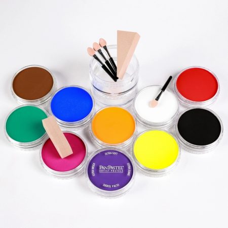 Selection of primary, secondary and black & white for mixing tints and shades. All colors can be mixed to create intermediate colors. Set includes 10 PanPastel colors and a selection of Sofft Tools.