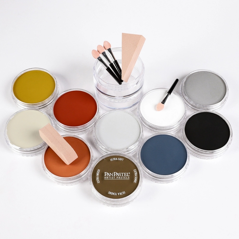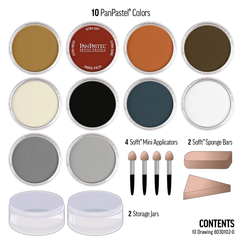 Selection of drawing colors (including black, white, grays & earth colors). All colors can be mixed to create intermediate colors. Set includes 10 PanPastel colors and a selection of Sofft Tools.