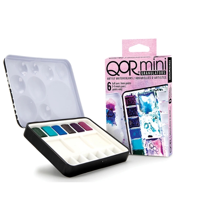 A collection of our favorite granulating QoR colors. Selected for artists who adore this unique watercolor effect. The inclusion of six empty half pans expands the potential even further by allowing the artist space to customize their palette.
