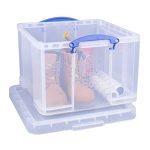 This Really Useful Box is a transparent, solid plastic box for multi-purpose storage. The 42 litre box comes with a lid and clip lock handles to keep its contents secure.