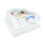 This Really Useful Box is a transparent, solid plastic box for multi-purpose storage. The 70 litre box comes with a lid and clip lock handles to keep its contents secure.