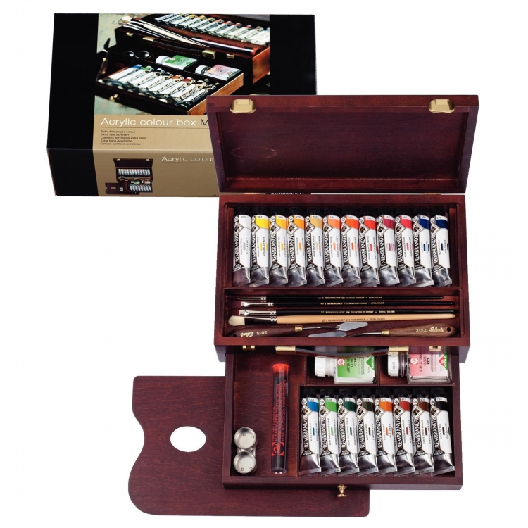 This box also includes 1 bottle 75 ml Talens Acrylic medium glossy, 2 brushes: Series 290 no. 8 & series 291 no. 6, a double palette cup, a tube with 3 sticks charcoal, a wooden palette and a colour mixing brochure.