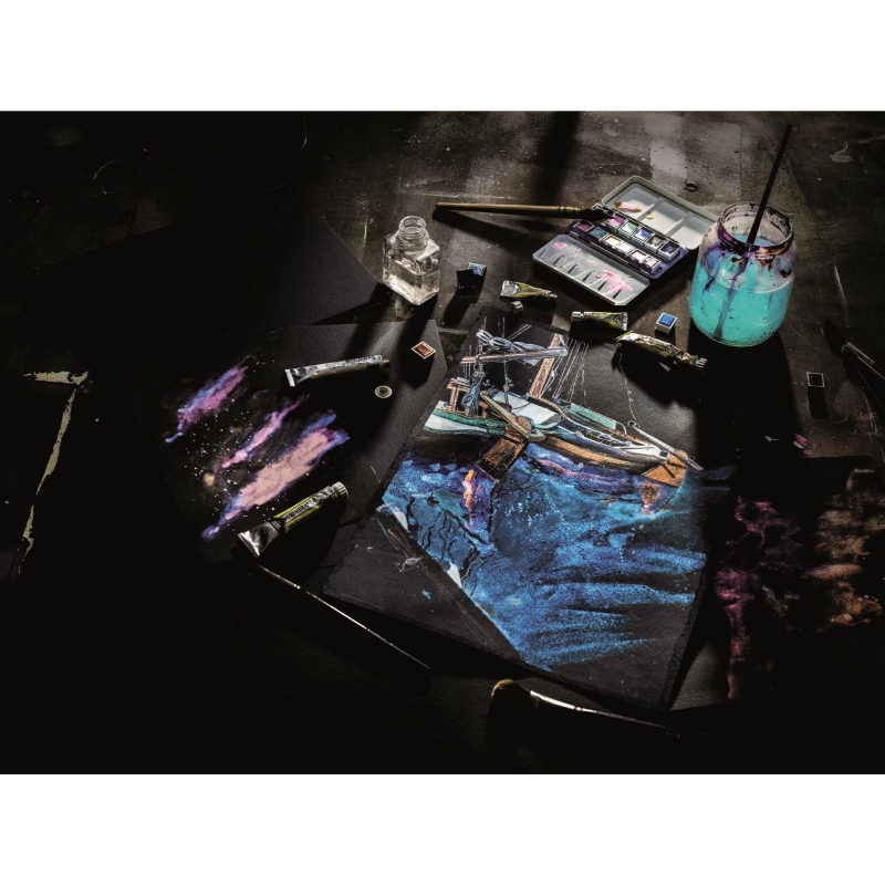 Rembrandt watercolour paper is made of high-quality cellulose. This deep-black paper offers a great background for gouache, more opaque watercolours and the range of Rembrandt specialty watercolours that include sparkling metallic, pearlescent, and colour-shifting shades.