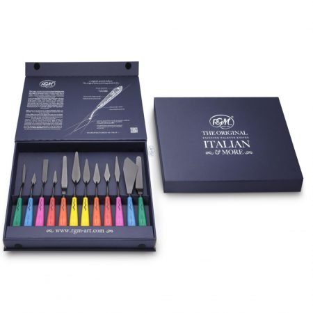 RGM’s Plus Line Palette Knives features a special electrolytic coating that optimises the functionality of the spatulas and the spreadability of colour, making it suitable for every need during painting. The ergonomic handle is produced with colourful rubber, the blade firmly fixed to the handle with a polished brass or matte black ring nut. The blade is tempered and ground by hand to assure consistent flexibility and quality.