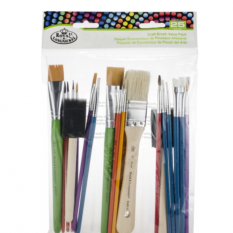 Royal Langnickel Craft Brush 25 Piece Value Pack is perfect for all crafting needs. Can be used with acrylic, watercolour, oil and tempera paints. Includes natural hair, synthetic, and foam brushes in a variety of sizes.