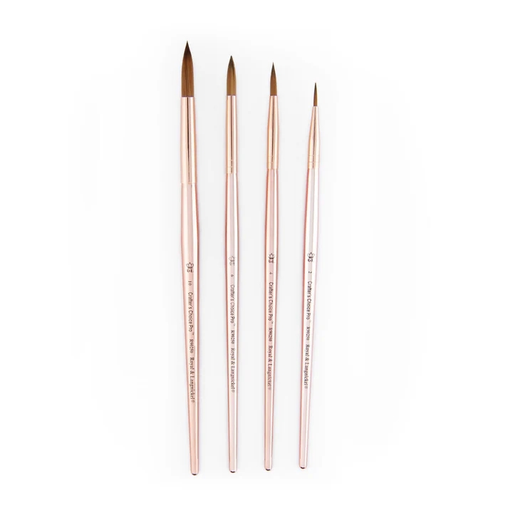 ROYAL & LANGNICKEL CRAFTER’S CHOICE PRO’s sophisticated brushes are expertly constructed with the finest synthetic sable hair that is durable and easy to clean. The elegant metallic rose handles are eye-catching, and won’t swell, crack, or chip in water. CRAFTER’S CHOICE PRO works perfectly with nearly all craft mediums and surfaces. Excellent for all skill levels!