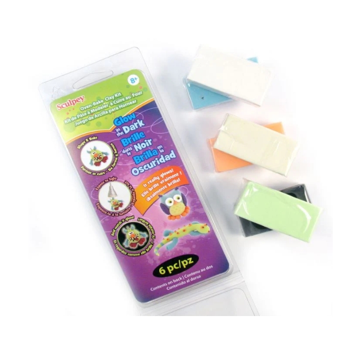• Set includes: 4x 28g bars of Glow-in-the-Dark clay: Glow in the Dark, Glow in the Dark Orange, Glow in the Dark Blue, Glow in the Dark Green and 2 x 28g bars Sculpey® III clay in Black and White