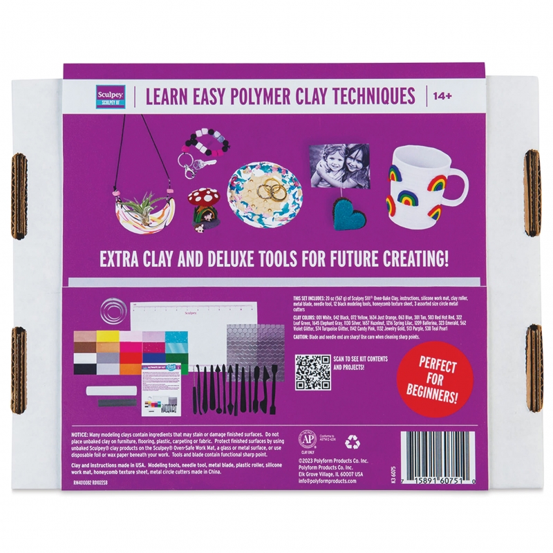 - Tools: Stainless Steel circle cutters 3pc, 12 piece plastic modeling tool set, silicone mat, needle tool, metal blade, plastic roller, hexagon texture sheet, and instruction manual teaching basic techniques and 6 projects.