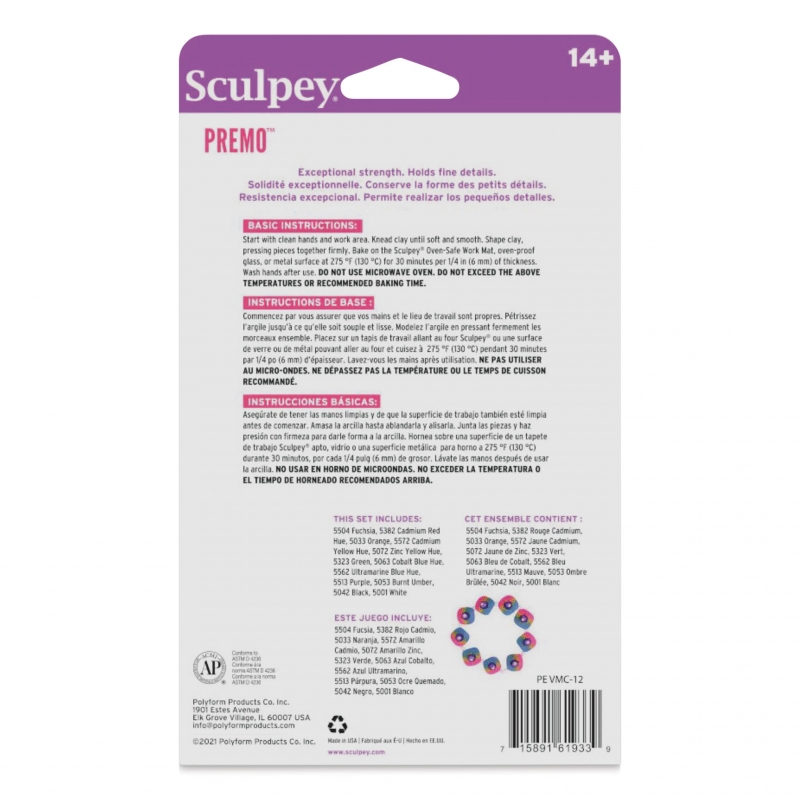POLYFORM-Premo Sculpey Oven Back Clay Multipack. Perfect for creating jewelry and home decor! There are endless possibilities with this clay! This package contains twelve 1 oz pieces of clay. Premo Sculpey is an artists dream come true! After conditioning this clay is soft enough to blend easily, but firm enough to hold fine details. Because Premo retains its flexibility after being cooked, the final product remains quite strong and durable.