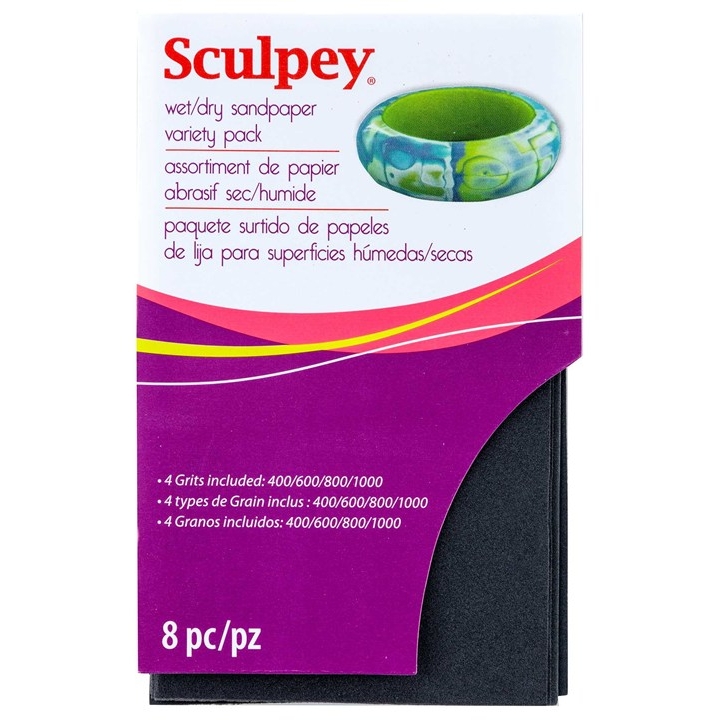 Perfect for use with Polymer Oven-Bake Clay – The Sculpey Tools 8 piece Sandpaper Set is perfect for sanding polymer oven-bake clay into a glassy smooth finish. Sanding and buffing will give your polymer clay creations a professional looking finish that cannot be achieved by glaze. Tips for using the Sculpey Tools 8 Piece Variety Pack. Sculpey Wet/Dry Sandpaper is an easy and fast way to add a beautiful finish and texture to any of your projects. Perfect for paper crafts, jewelry projects and more .