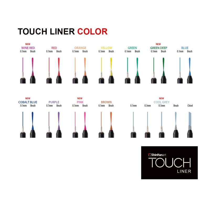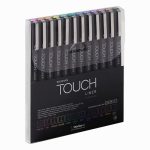 The set includes 12 “Touch Liners” with a 0.1mm writing unit in the following colors: wine red, pink, red, orange, yellow, green, deep green, blue, cobalt blue, violet, brown, cold gray.