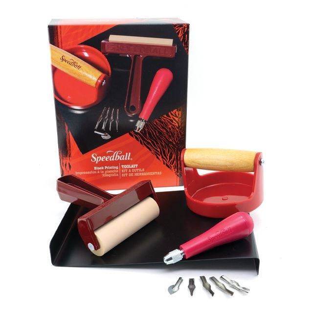 The Speedball Block Printing Tool Kit contains all the essential block printing tools you need to begin making beautiful relief prints. Includes a Brayer, Bench Hook/Inking Plate, Lino Handle with Lino Cutter blades, and a Baren.