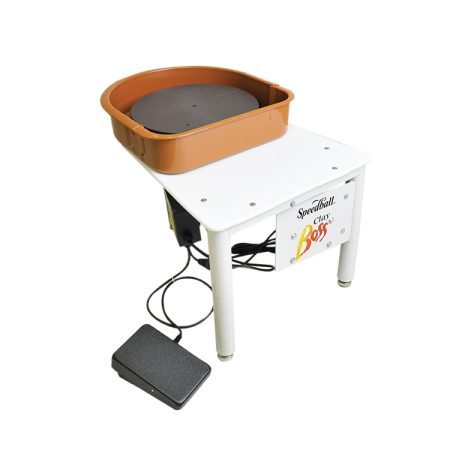 The Clay Boss features a polyethylene tabletop and two-part splash pan for easy cleanup, 14” wheel head and foot pedal with smooth, variable speed control (0-240 rpm).  Its reversing plus allows for quick and easy changes of wheel direction, and its sophisticated load-sensing control ensures that the wheel head speed is maintained under changing loads.