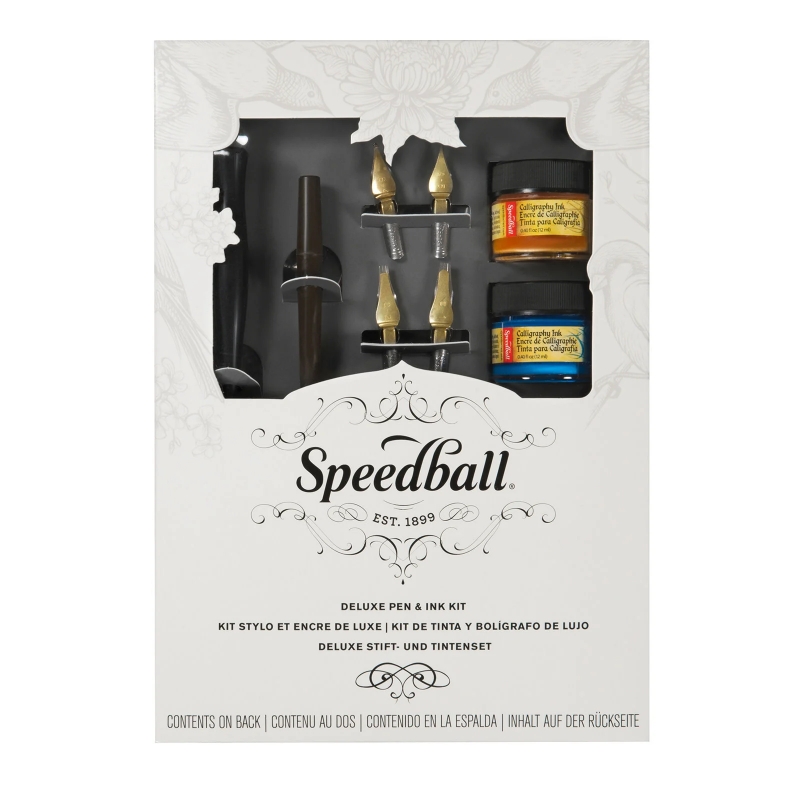 - Includes three 12ml jars of Super Pigmented Acrylic Ink (Scarlet Red, Indigo Blue, Gold), one 12ml jar of Pen Cleaner, 4 broad edge nibs (A-5, B-4, C-1, C-2), a #102 Crowquill nib, a #107 Hawk Quill nib, a Standard Penholder, a Crow quill Penholder, a Speedball Textbook, practice paper, one five-well palette, an eye dropper and a brush