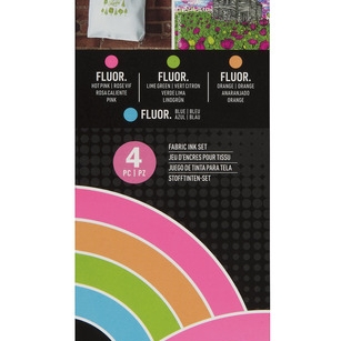 Set includes:- (4) 4oz (118ml) jars of Fabric Screen Printing Ink in Fluorescent Hot Pink, Fluorescent Lime Green, Fluorescent Orange, Fluorescent Blue.