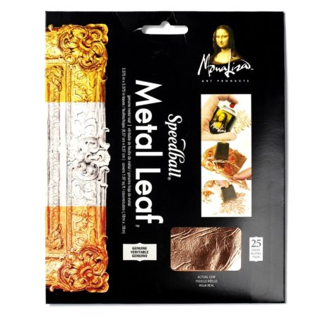Speedball® Mona Lisa metal leaf Made of 23 Karat Gold, Genuine Copper, Speedball’s Genuine Metal Leaf allows artists to incorporate precious metals into any fine art, craft or home décor project to create stunning and unique effects. Size: 5.5” x 5.5” sheets 25 sheets per pack