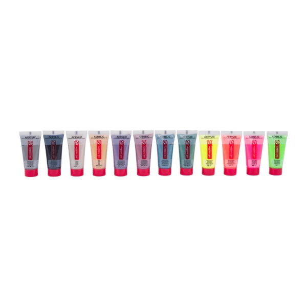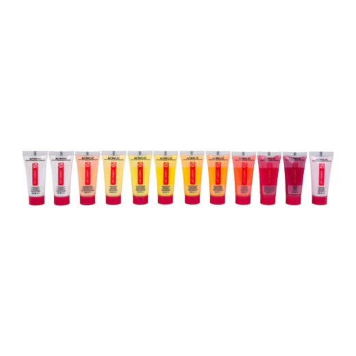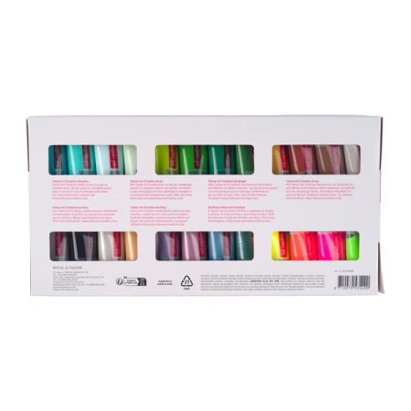 Contents: 48 x 12 ml tubes (105 Titanium White 2x – 224 Naples Yellow Red – 226 Pastel Yellow – 267 Azo Yellow Lemon – 275 Primary Yellow – 269 Azo Yellow Medium – 270 Azo Yellow Deep – 276 Azo Orange – 396 Naphthol Red Medium – 318 Carmine – 390 Pastel Rose – 366 Quinacridone Rose – 369 Primary Magenta – 567 Permanent Red Violet – 584 Pastel Lilac – 568 Permanent Blue Violet – 580 Pastel Blue – 517 Kings Blue – 512 Cobalt Blue Ultra – 504 Ultramarine – 572 Primary Cyan – 570 Phthalo Blue – 564 Brilliant Blue – 661 Turquoise Green – 673 Phthalo Green Light – 678 Mint Green – 666 Pastel Green – 617 Yellowish Green – 618 Permanent Green Light – 619 Permanent Green Deep – 652 Leaf Green – 227 Yellow Ochre – 411 Burnt Sienna – 409 Burnt Umber – 718 Warm Grey – 710 Neutral Grey – 701 Ivory Black – 800 Silver – 801 Gold – 833 Metallic Rose – 835 Metallic Violet – 834 Metallic Blue – 836 Metallic Green- 256 Reflex Yellow – 257 Reflex Orange – 384 Reflex Rose – 672 Reflex Green).