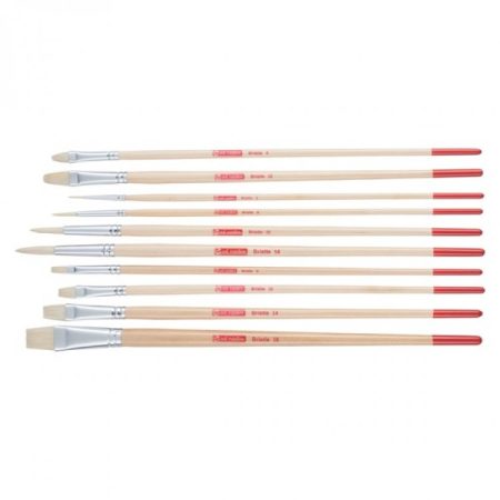 This brush set of hog bristle is suitable for oil colour, acrylic colour and gouache and contains the following types and sizes: Round brushes in sizes 2, 6, 10 and 14, Cat tongue brushes in sizes 8 and 12, Flat brushes in sizes 6, 10, 14 and 18