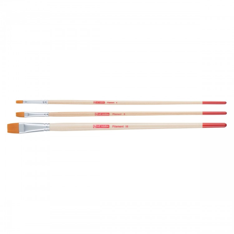 This brush set of polyester is suitable for oil colour, acrylic colour and gouache and contains the following types and sizes: Flat brushes in sizes 4, 8 and 16