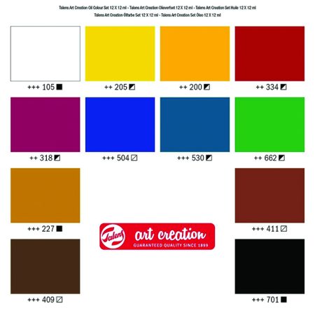 Talens Art Creation oil colour is a versatile type of paint which you can use both thin and very pasty. The paint is made from pigments and vegetable oil and gives intense colours. These oil colours are suitable for all oil painting techniques, such as ‘wet-into-wet’, layered painting and glazing