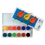 Contents: water colour set 12 x 12 ml (colours: 108-200-334-326-504-535-617-602-227-411-409-708), paperblock, 2 brushes, mixing tray, pencil and kneadable eraser.
