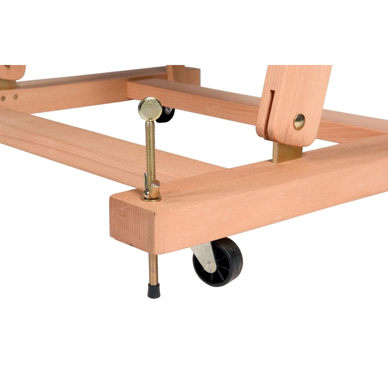 Double tray for artists’ materials Adjustable foot Increased working height to 143 cm (eye level) Large knobs for easy adjustment Easy to move thanks to castors – Can be tightened with 2 clamping screws.