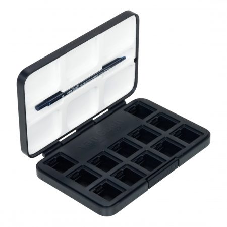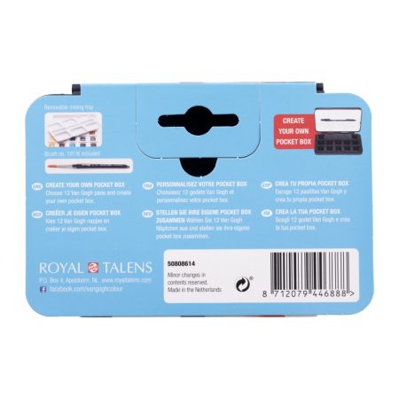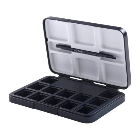 This plastic travel pocketbox comes empty, but with room to hold 12 half pans of van Gogh watercolour paints (sold separately). Select your own pans to create a custom set for your own palette preference! The pocketbox includes also includes a synthetic brush No6 from Series 191.This sturdy plastic pocketbox is lightweight and easy to take your watercolour paint with you.